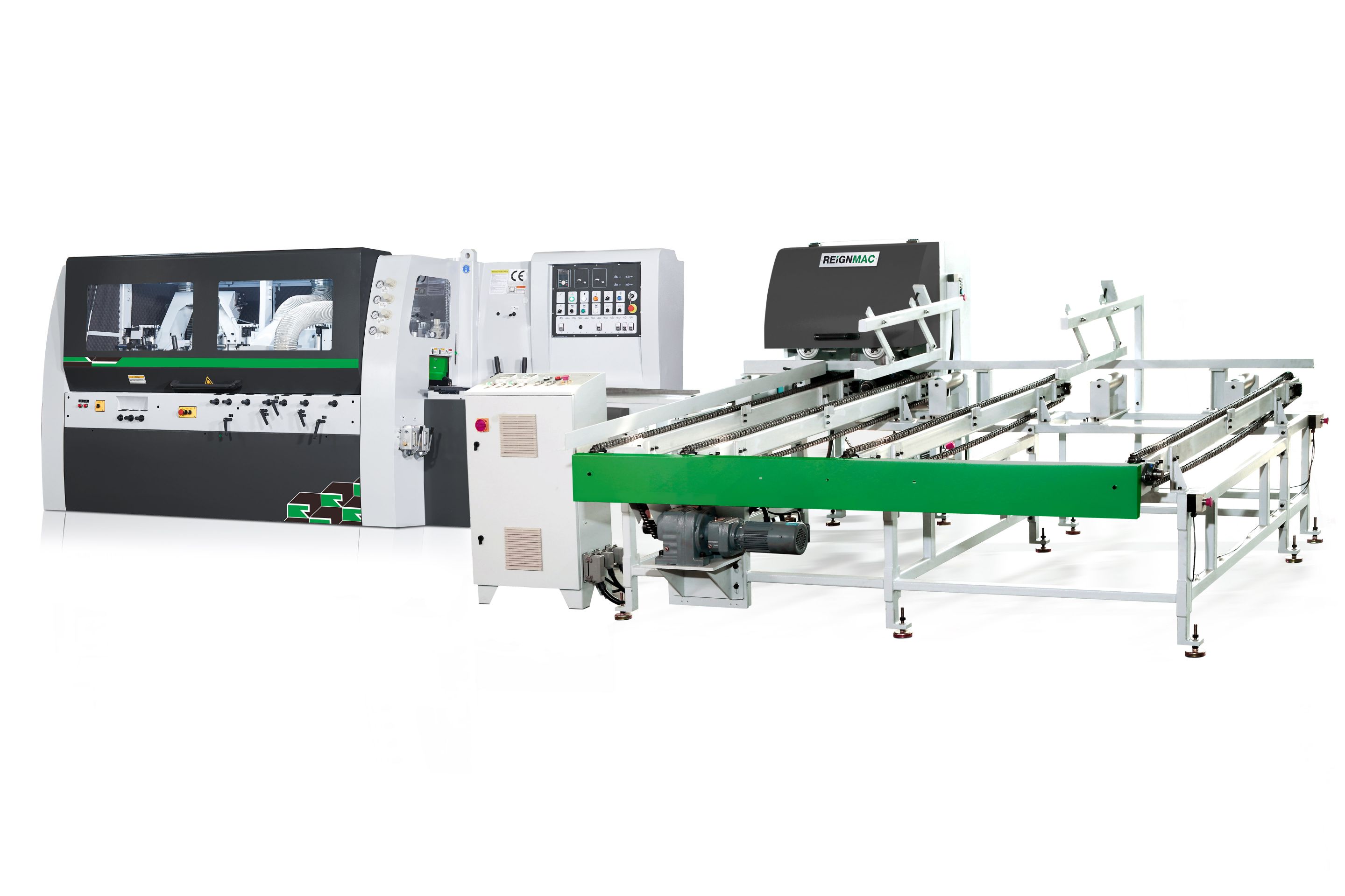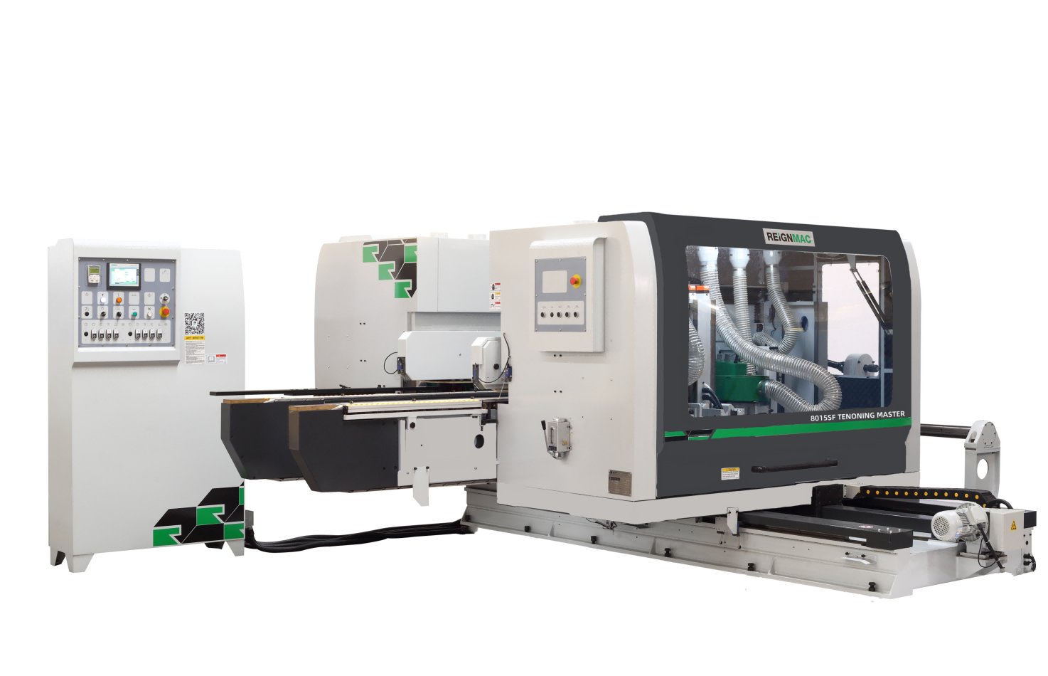 RMD6025M PRO Double End Tenoner is another double end tenoner machine with higher machining accuracy exhibited this time. It features a brand new track synchronous feeding system, a brand new synchronous clamping system, and is equipped with Siemens control system. The diagonal accuracy of the workpiece is more guaranteed, which can better meet the high-precision machining needs of solid wood furniture and panel processing, making technical difficulty the professional advantage of REIGNMAC Double End Tenoner.